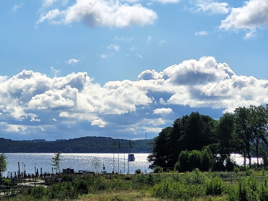 Ett bildpotpurri från juli månad 2024. Ekerö Strand, Pendelbåten Lux, Tappströmskanalen, JM:s första bygge Tegelbruket, Centrum och ännu obebyggda områden.