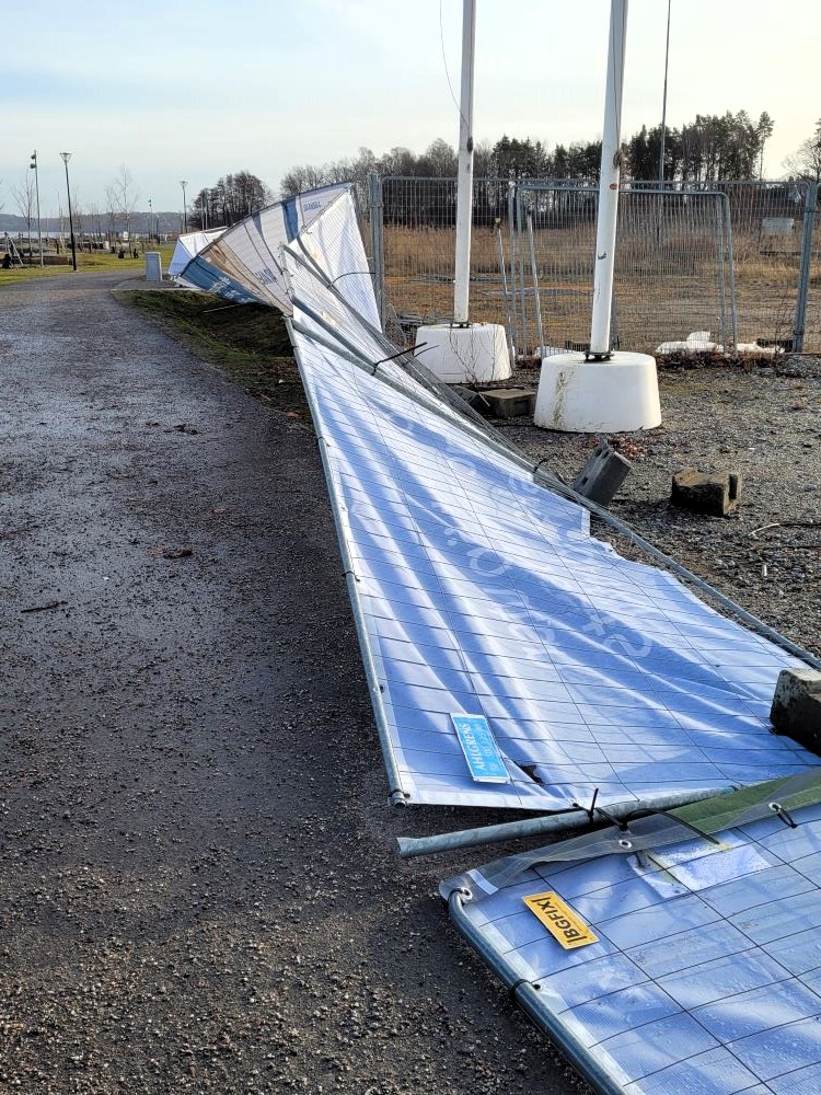Reklamaffischerna fladdrar hårt i vinden. Nu förstärker man och stagar upp stängslet igen.