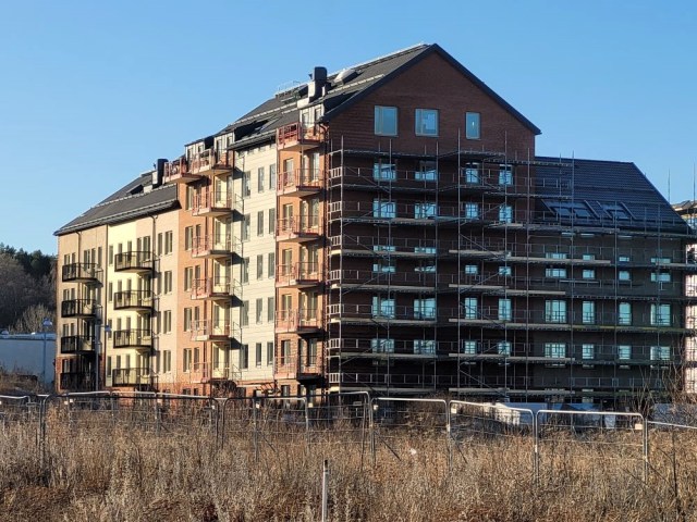 Ännu sitter skyddsplasten kvar på JM-bygget kv. Tegelbruket