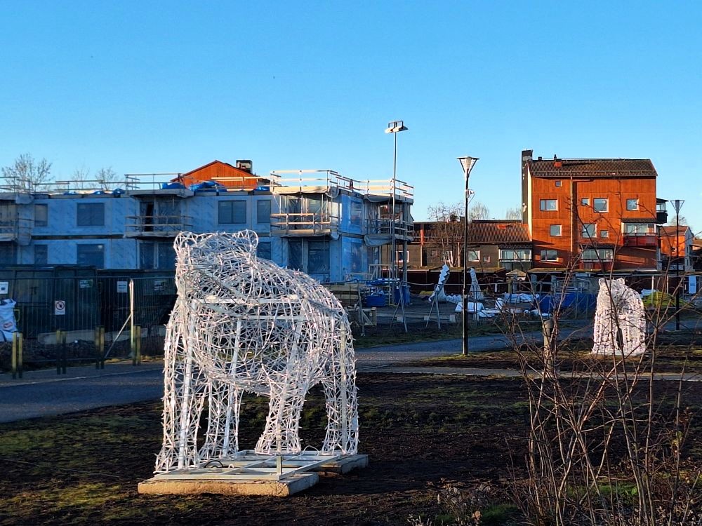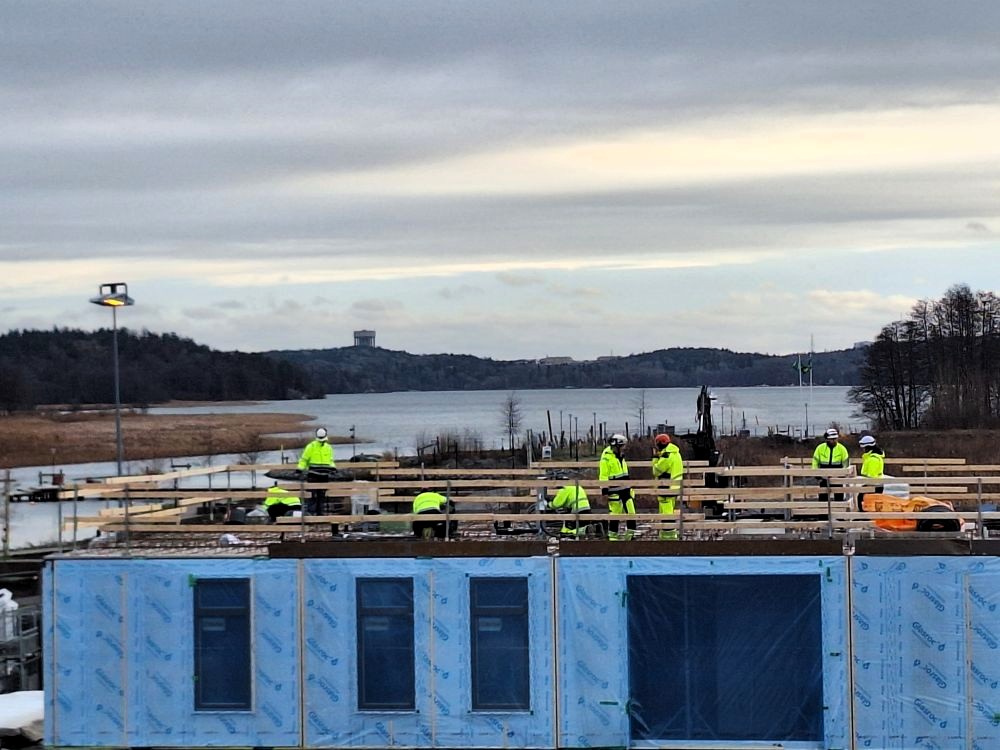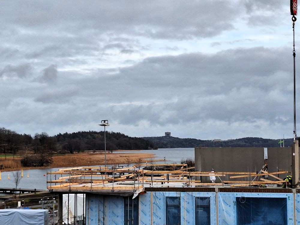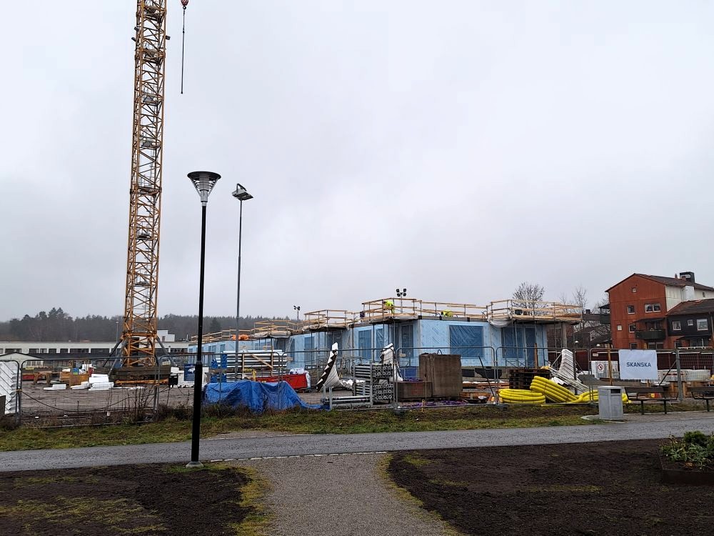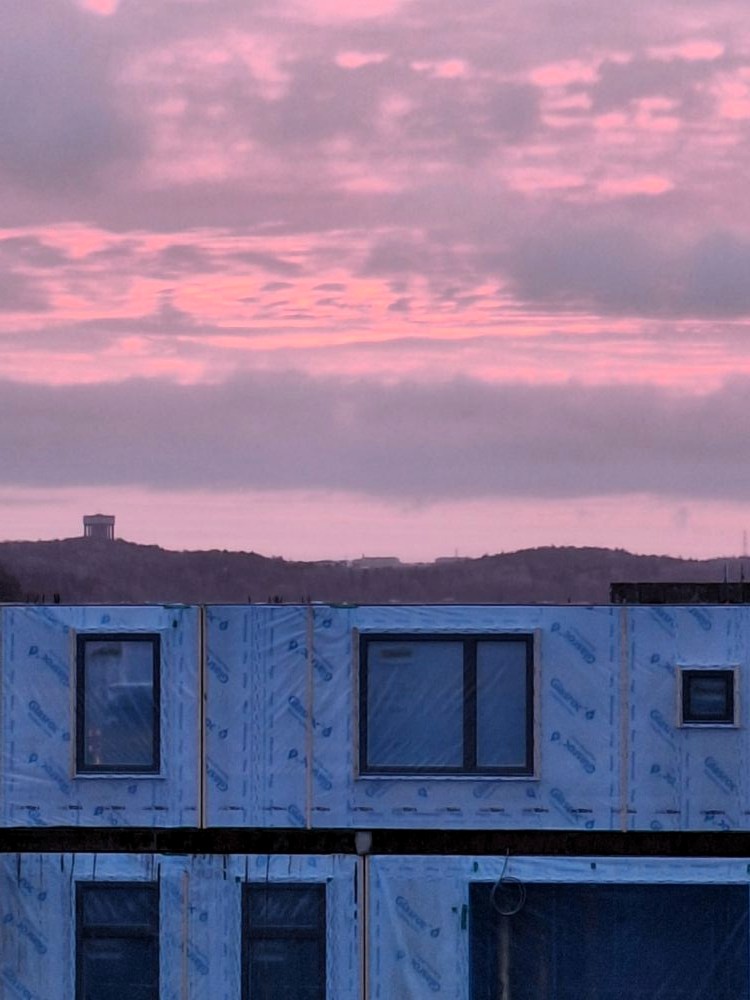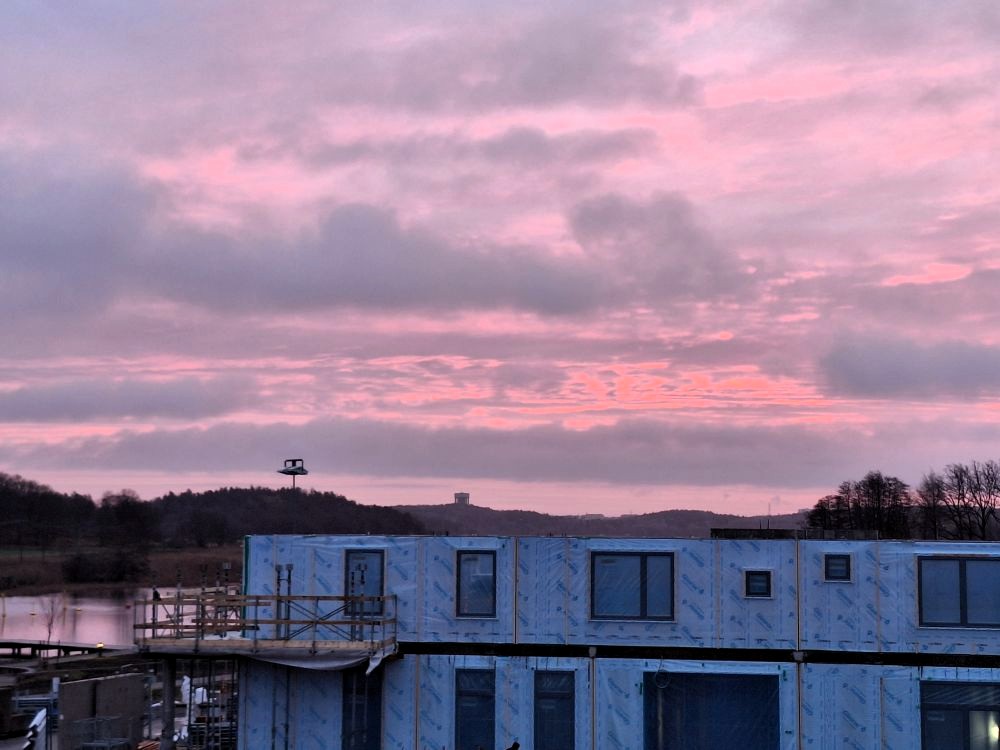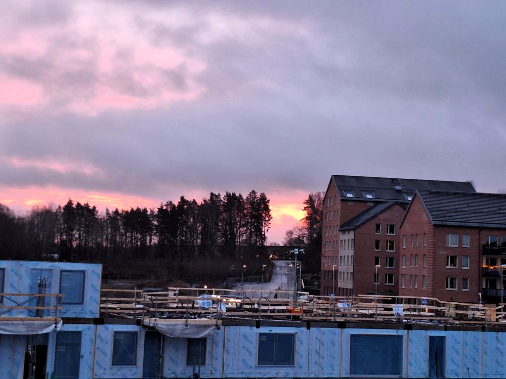 Morgonhimmel över bygget på kvarteret Idyllen: Jungmansgränd och Styrmansgränd