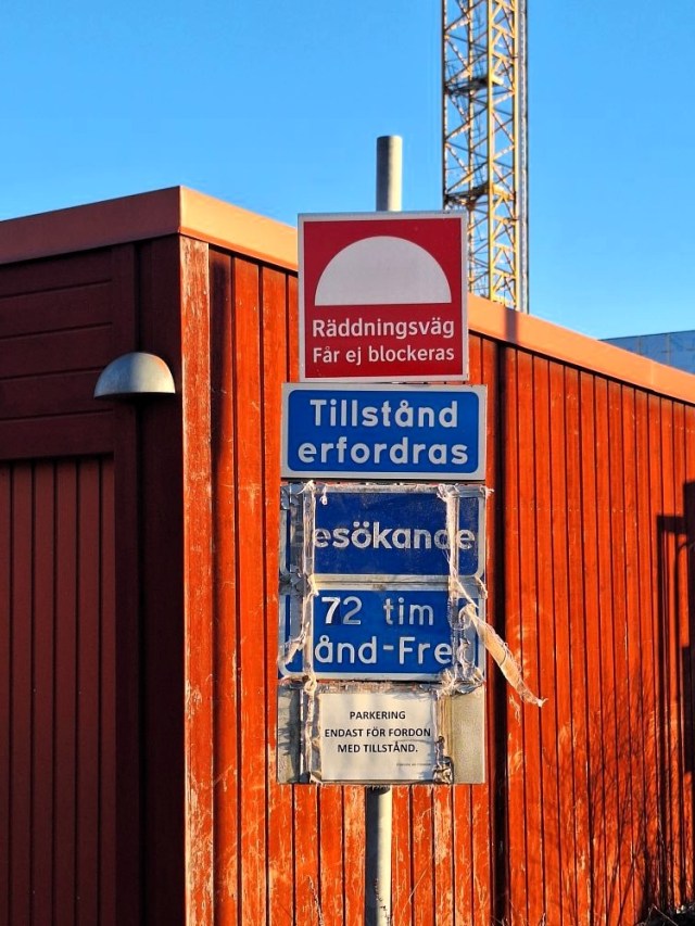 Rörig vägskyltning på Pråmvägen. Svårt för hemtjänst- och budbilar m-fl. att hitta rätt.
