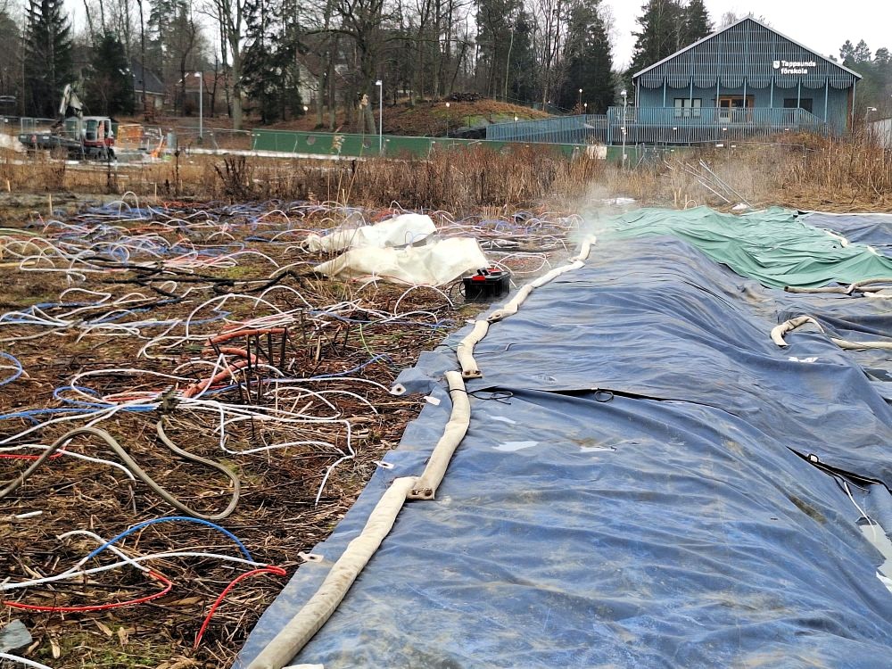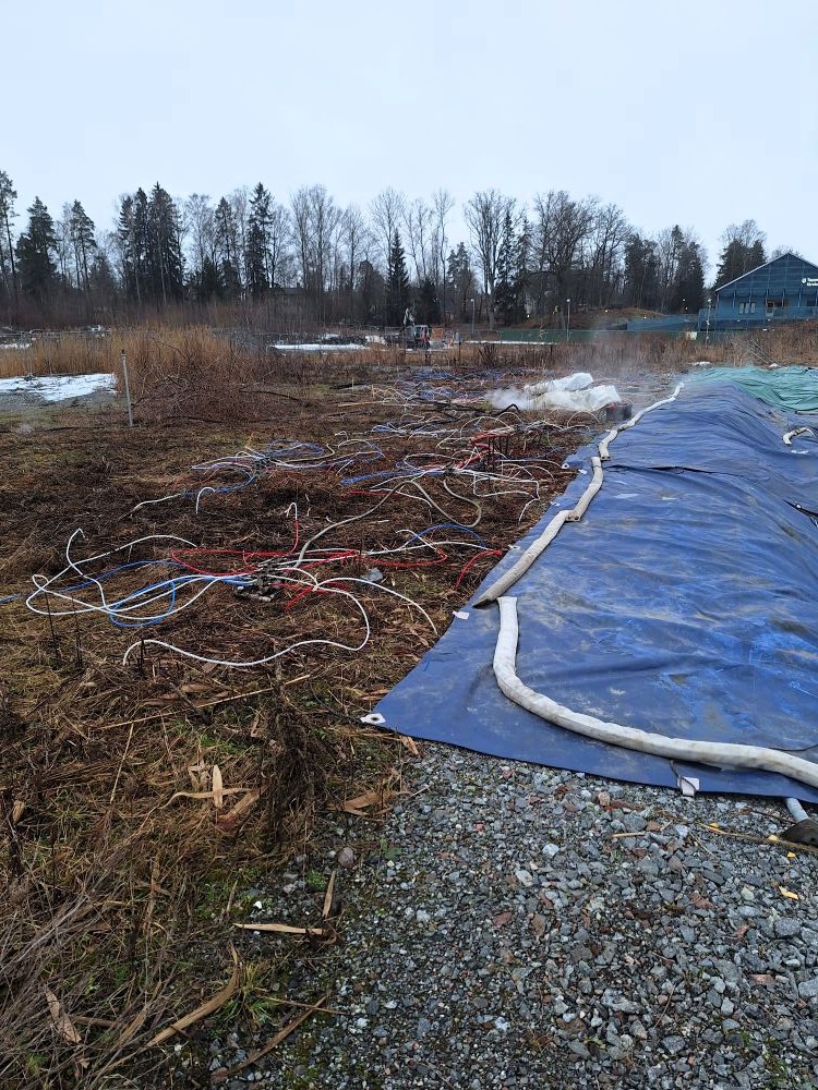 Här kokar, bubblar och ryker det när man utrotar ej önskvärda växter på blivande lekplatsen på Ekerö Strand. Ser ganska farligt ut.
