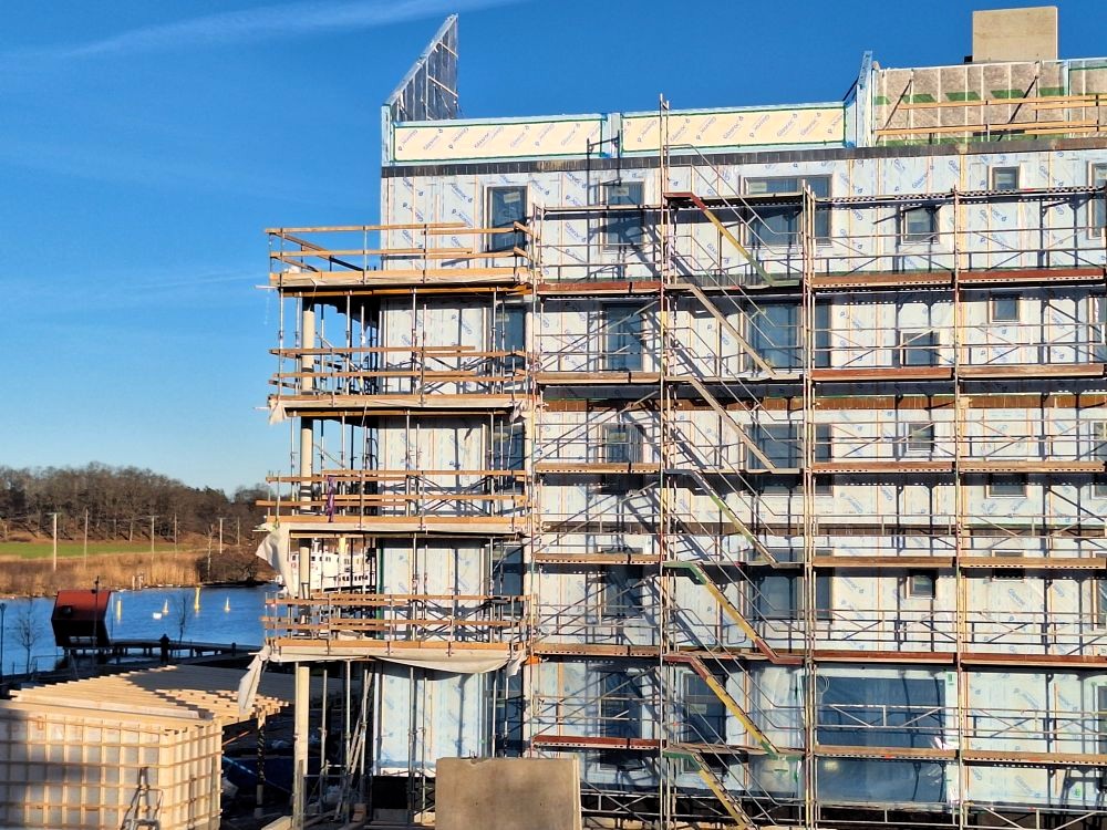 Efter en kall och snörik februari kom solen och värmen tillbaka i slutet av månaden. Bygget av kvarteret Idyllen pågick hela tiden. Nu håller man som bäst på med vinden på femvåningshuset. Fyra våningar hade varit bra. Det byggdes för högt och stör omgivningen från alla håll.