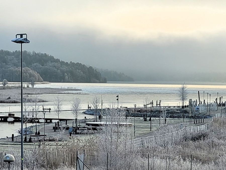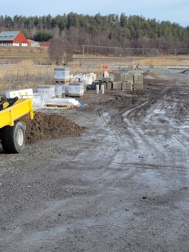 Bilder på det nya Ekerö Strandområdet invid Ekerö Centrum. Arbetet med kvarteret Tegelbruket fortgår. Det är mycket takarbeten som kvarstår. På marken runtomkring där det planerats för en stor lekplats och en alléväg verkar projekten dock stå stilla.