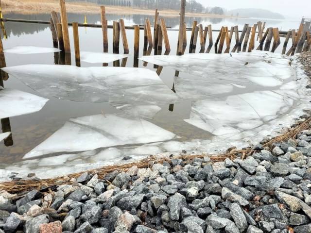 Strandbild på de märkliga pålarna som står i vattnet. Kanske ska de utgöra ett hinder för småbåtar att lägga till eller är det en slags installation?